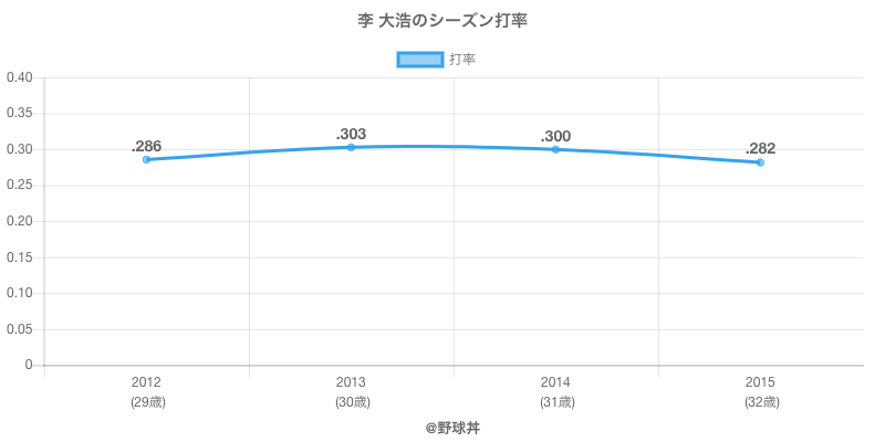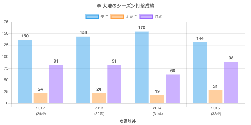 李 大浩 (43歳)は2012年から2015年にかけて活躍した元オリックスや福岡ソフトバンク所属のプロ野球選手です。 投打は右投右打で、守備位置は主に一塁手ができ、日本球界初出場は2012年で当時30歳でした。 同年代には荻野(元千葉ロッテ)や新田(元東京ヤクルト)がいます。 過去には2012年オリックスで全144試合出場ヒット150本や2014年福岡ソフトバンクで全144試合出場ヒット170本という結果を残しています。 また1度主要タイトルを獲得しています。(最多打点1回)