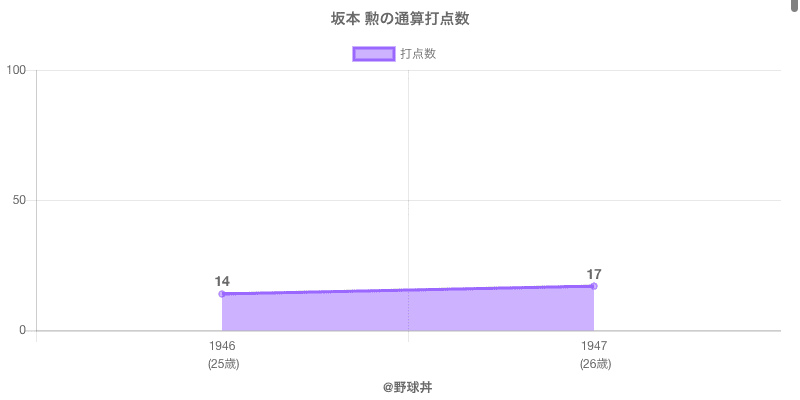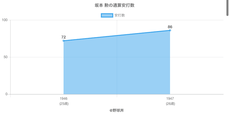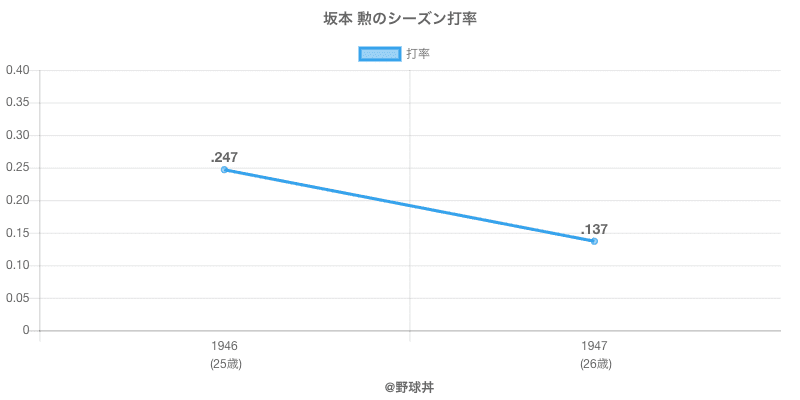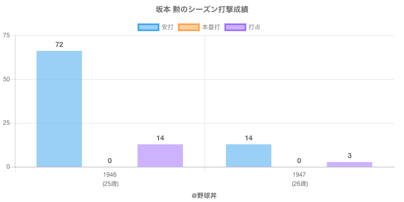 坂本 勲は1946年から1947年にかけて活躍した元金星やゴールドスター所属のプロ野球選手です。 投打は右投右打で、守備位置は主にができ、日本球界初出場は1946年で当時25歳でした。 同年代には西沢(元中日)や桶川(元グレートリング)がいます。 過去には1946年ゴールドスターで全96試合出場ヒット72本や1947年金星で全59試合出場ヒット14本という結果を残しています。
