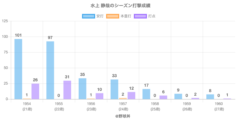 水上 静哉 (93歳)は1954年から1960年にかけて活躍した元東映や阪神所属のプロ野球選手です。 投打は右投右打で、守備位置は主に遊撃手・二塁手・三塁手ができ、日本球界初出場は1954年で当時22歳でした。 同年代には百々(元大映)川島(元国鉄)がいます。 過去には1955年東映で全135試合出場ヒット97本や1954年東映で全124試合出場ヒット101本という結果を残しています。