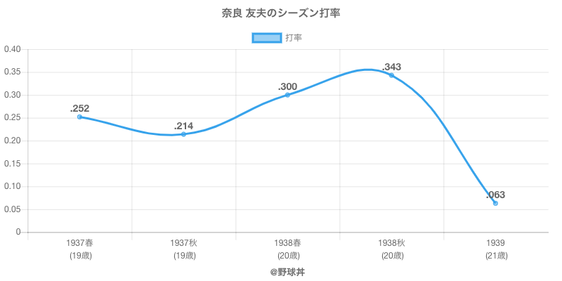 | 1938秋 | 22 | 70 | .343 | 24 | 0 | 5 | |