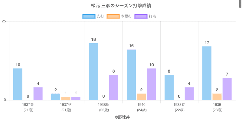 | 1938秋 | 19 | 66 | .242 | 16 | 2 | 10 | |