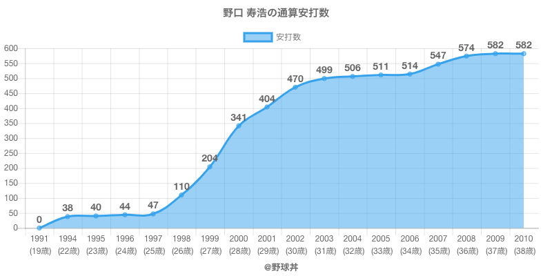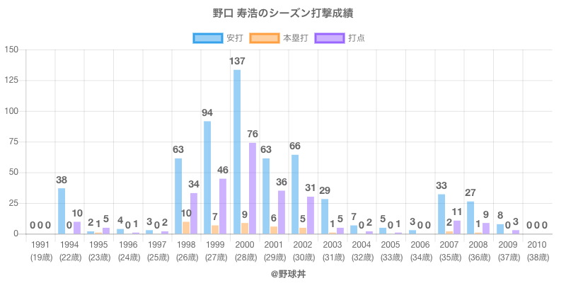 野口 寿浩 (54歳)は1991年から2010年にかけて活躍した元日本ハムや阪神所属のプロ野球選手です。 投打は右投右打で、守備位置は主に捕手ができ、日本球界初出場は1991年で当時20歳でした。 同年代にはアンヘル(元北海道日本ハム)や平松(元日本ハム)がいます。 過去には2000年日本ハムで全134試合出場ヒット137本や1999年日本ハムで全130試合出場ヒット94本という結果を残しています。