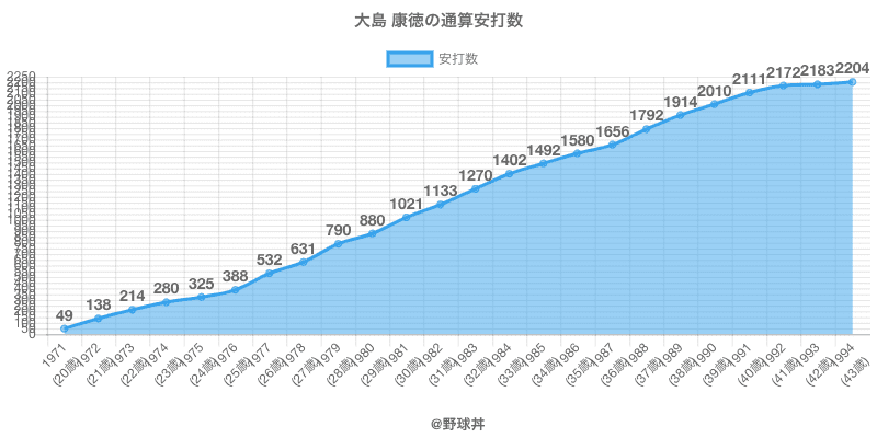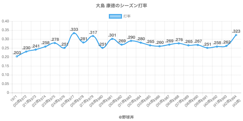 大島 康徳 (75歳)は1971年から1994年にかけて活躍した元中日や日本ハム所属のプロ野球選手です。 投打は右投右打で、守備位置は主に外野手・三塁手・一塁手・DHができ、日本球界初出場は1971年で当時21歳でした。 同年代には新井(元阪神)小林(元ヤクルト)がいます。 過去には1979年中日で全130試合出場ヒット159本や1981年中日で全130試合出場ヒット141本という結果を残しています。 また1度主要タイトルを獲得しています。(最多本塁打1回)