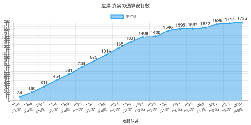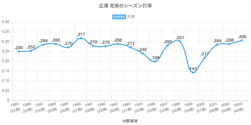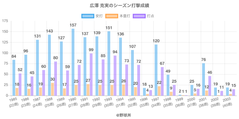 広澤 克実 (63歳)は1985年から2003年にかけて活躍した元阪神や読売所属のプロ野球選手です。 投打は右投右打で、守備位置は主に一塁手・外野手・三塁手ができ、日本球界初出場は1985年で当時23歳でした。 同年代にはジョニー(元ヤクルト)ウィッグス(元阪神)がいます。 過去には1991年ヤクルトで全132試合出場ヒット137本や1993年ヤクルトで全132試合出場ヒット151本という結果を残しています。 また2度主要タイトルを獲得しています。(最多打点2回)