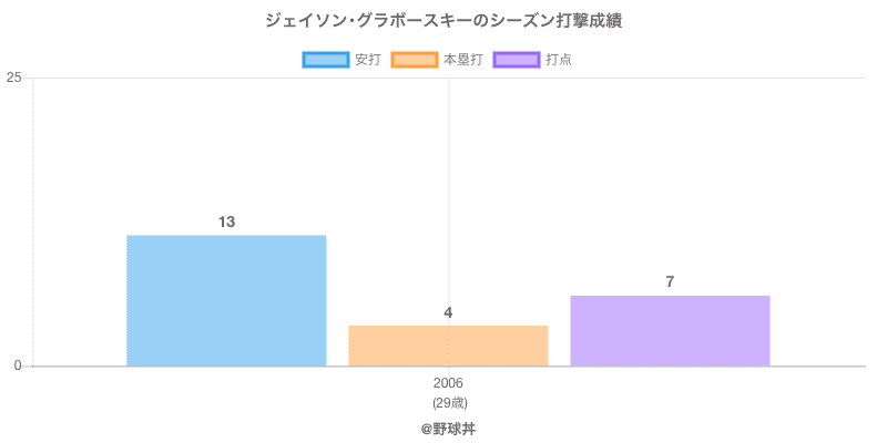 ジェイソン・グラボースキー (49歳)は2006年から2006年にかけて活躍した元オリックス所属のプロ野球選手です。 投打は右投左打で、守備位置は主にができ、日本球界初出場は2006年で当時30歳でした。 同年代には遠藤(元日本ハム)マット(元埼玉西武)がいます。 過去には2006年オリックスで全39試合出場ヒット13本という結果を残しています。
