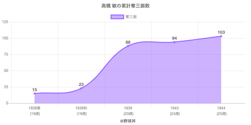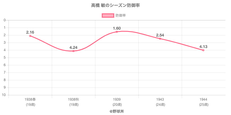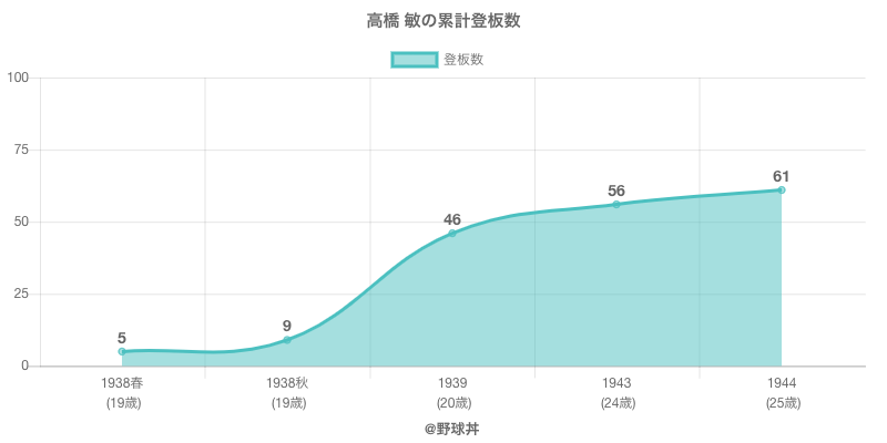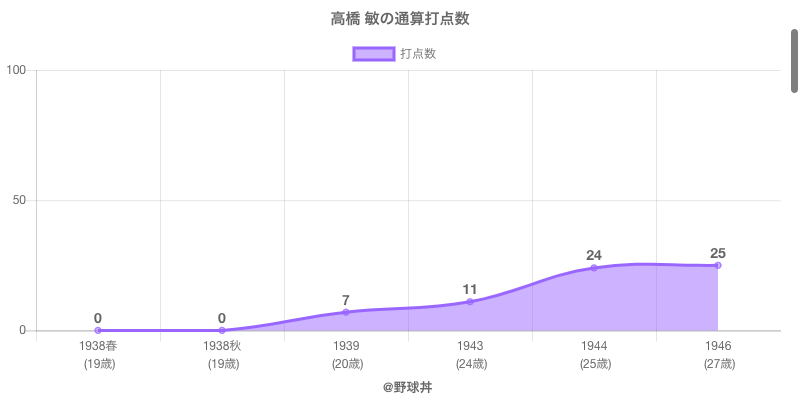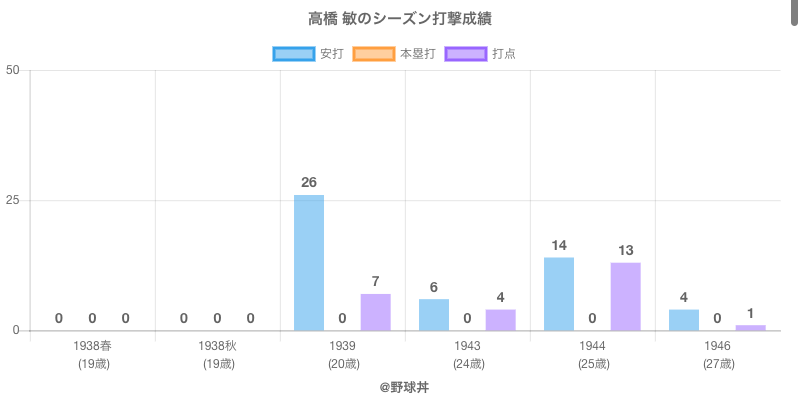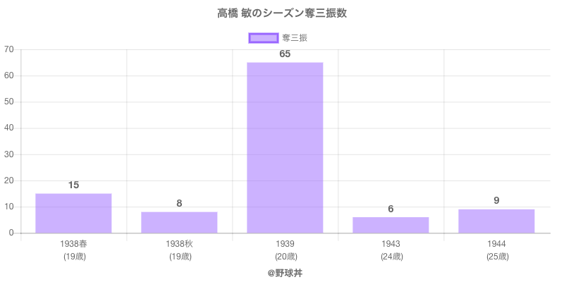 高橋 敏は1938春年から1946年にかけて活躍した元阪急所属のプロ野球選手です。 投打は右投右打で、守備位置は主に投手、日本球界初出場は1938春年で当時19歳でした。 同年代には深見(元南海)沢藤(元近鉄)がいます。 過去には1939年阪急で全37試合出場防御率1.60や1943年阪急で全10試合出場防御率2.54という結果を残しています。