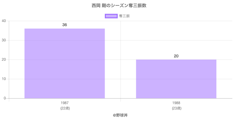 西岡 剛 (61歳)は1987年から1988年にかけて活躍した元ヤクルト所属のプロ野球選手です。 投打は右投右打で、守備位置は主に投手、日本球界初出場は1987年で当時23歳でした。 同年代には高島(元福岡ダイエー)や加藤(元広島東洋)がいます。 過去には1987年ヤクルトで全27試合出場36奪三振や1988年ヤクルトで全12試合出場20奪三振という結果を残しています。 また3度主要タイトルを獲得しています。(最多盗塁2回 / 首位打者1回)